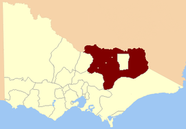 It was based in north-eastern Victoria, south of the Murray River.[2] Its area was defined in the Victorian Constitution Act of 1855 as: "Bounded on the South and West by the Counties of Evelyn and Anglesea and the River Goulburn to its Junction with the River Murray; on the North and North-east by the River Murray ; and on the East by the great dividing Range, excepting the Country comprised in the Electoral Districts of the Murray Boroughs and of Beechworth" (Ovens).[3]