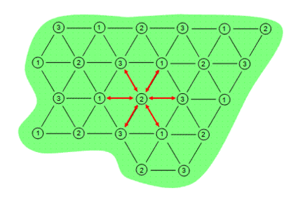There are predominantly two electrical load arrangements for ERH: three-phase and six-phase. Three-phase heating consists of electrodes in a repeating triangular or delta pattern. Adjacent electrodes are of a different electrical phase so electricity conducts between them as shown in Figure 1. The contaminated area is depicted by the green shape while the electrodes are depicted by the numbered circles.