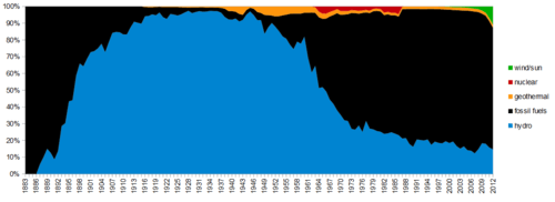 Italy is the world's 14th largest producer of hydroelectric power, with a total of 41,456 GWh produced in 2012.[10] Energy from hydro accounted for about 18% of the national production in 2010, with hydroelectric plants located mainly in the Alps and the Apennines.[11] From the beginning of the 20th century to the 1950s, hydroelectric power accounted for the majority of generated power, but as energy needs increased approaching the 21st century that percentage dropped significantly.