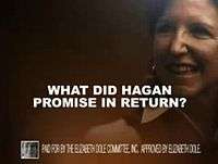 In late October, Dole released a controversial television ad attacking Hagan for reportedly taking donations from individuals involved in the Godless Americans PAC, a group which advocates for the rights of people who do not believe in God. The ad also included a female voice saying, "There is no God." Hagan's campaign said the ad sought to put inflammatory words in their candidate's mouth. Hagan, who is a member of the Presbyterian Church and a former Sunday school teacher,[23] condemned the ad as "fabricated and pathetic," and, according to Hagan's campaign website, a cease-and-desist letter was "hand-delivered to Dole's Raleigh office and to her home at the Watergate in Washington, DC."[24] Hagan also filed a lawsuit in Wake County Superior Court accusing Dole of defamation and libel.[25][26] The ad met significant criticism from some members of the public as well national media outlets. After the first ad Hagan received over 3,600 contributions, including major donors as well as individual support from a range of persons who believed in the right to participate in civil government free of religious orthodoxy requirements. Following the second ad Hagan's lead doubled according to some polls.[27]
