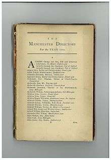 - Raffald, Elizabeth (1772). Directory of Manchester and Salford, 1772. Manchester.