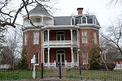 The Elliott House is a historic house at 303 South Third Street in Bentonville, Arkansas. It is a large three-story brick house with Italianate style, built in 1887 for Harry Elliott, who made a fortune investing in silver mines in Silver City, New Mexico. The house is distinctive for its use of brick on the interior as well as exterior walls; those on the inside are 8 inches (20 cm) thick, those outside are 16 inches (41 cm). The exterior features include seven porches, a widow's walk, and carved brackets in deeply overhanging eaves.[2]