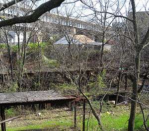 The station opened on February 23, 1886 as a surface station.[4][5] In the early 1930s as part of a grade crossing elimination project, the station was depressed into the current open-cut below grade level, and rebuilt with concrete platforms.[2][4][5][6][7] The platforms are slightly offset due to the right-of-way crossing at a diagonal with the streets in the neighborhood;[1][5] each measures about 240 feet (73 m) in length, which would fit three cars of the former ME-1 rolling stock (67 feet in length) or of the current R44 SIR cars (75 feet in length).[1] Exit stairs were located at the west end of the station towards Morningstar Road. An overpass from Eaton Place to Newark Avenue over the line (not connected to the station) was located at the station's east end under the Bayonne Bridge.[5] East of the station past John Street, the line rises onto a concrete trestle built in 1935.[2][4][5][7][8] Elm Park was closed on March 31, 1953, along with the South Beach Branch and the rest of the North Shore Branch.[4][5]