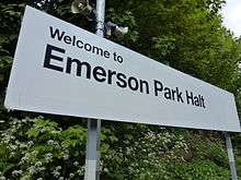 The Romford to Upminster Line was constructed in 1893 as a branch of the London, Tilbury and Southend Railway (LT&SR). Property development in the immediate area and in 1908 the proposed new railway station at Gidea Park on the Great Eastern Railway (GER) prompted the LT&SR to construct a station on their branch. The station was opened on 1 October 1909 as Emerson Park Halt[4] on the branch line from Romford to Grays via Upminster, where it connected with the main route from London Fenchurch Street. A run round loop was constructed 500 yards to the west to enable extra trains to run between Emerson Park and Upminster. When push-pull working began in 1934 the loop was not needed and taken out c. 1936.[5] Originally named Emerson Park Halt, and shown in some timetables and on some signage throughout its history as Emerson Park & Great Nelmes, the station name was later simplified to Emerson Park, but the date of this change is not recorded.[4] Even though the station has long been called Emerson Park, one former platform sign installed by National Express East Anglia in the late 2000s read: "Welcome to Emerson Park Halt".