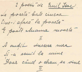 Emil Isac's work was published in several new editions during the decades after his death. Such volumes enlisted contributions from several authors and critics of the day: Ion Brad, Veronica Porumbacu, György Rába, Elemér Jancsó, Mircea Zaciu, Mircea Tomuş, Ion Oarcăsu, Leon Baconsky, Dumitru Micu, Constantin Ciopraga etc.[5] His contributions were gathered into a definitive Hungarian-language translation, printed in Bucharest in 1962, while his correspondence with Hungarian intellectuals was issued as Hungarian-language magazines and separate volumes, in both Romania and Hungary.[35] His various poems were included into several anthologies of Romanian poetry, or published individually, in Argentina, Belgium, Brazil, France, Greece, Hungary, Italy, the Soviet Union (Russian SFSR, Armenian SSR), and the United Kingdom.[21]