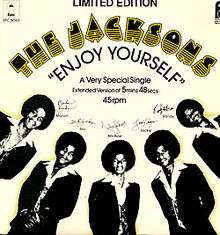 "Enjoy Yourself" is a song recorded by The Jacksons and released as a single in 1976 and peaking in early 1977. Featuring Michael and Jackie Jackson on lead vocals, it was the first non-Motown single for the group since they departed from the label earlier that year. The song peaked at #6 on the Billboard Hot 100 chart on February 19, 1977.[1] On other US charts, "Enjoy Yourself" peaked at #2 on the Hot Soul Singles chart,[2] and #33 on the National Disco Action Top 40 chart.[3] On February 14, 1989, it became the group's first single to be certified Platinum by the RIAA.[4] It was also the group's first song to feature new member Randy Jackson, who replaced Jermaine when he decided to stay at Motown after his brothers left. It also featured backing vocals from sisters Janet and La Toya, who would also launch successful solo careers. The song is sampled on the track "Let's Have a Party" by the Backstreet Boys, which appears on their 1996 self-titled debut album. The song is credited to Philadelphia songwriters/producers Gamble and Huff; however, a session musician from Gamble and Huff’s in-house band recalled that the late guitarist T.J. Tindall wrote the riff that was the initial spark for the song.[5]