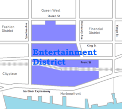 The Toronto Entertainment District is an area in Downtown Toronto, Ontario, Canada. It is concentrated around King Street West between University Avenue and Spadina Avenue.
