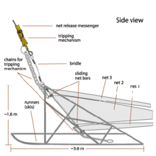 An Epibenthic sled is an instrument designed to collect benthic and benthopelagic faunas from the deep sea. The sled is made from a steel frame consisting of two skids and stabilizing planes to keep it from sinking too deep into the mud. Attached to the frame is a 1 mm mesh net to collect the samples.[1][2] The sled is towed along the seafloor at the sediment water interface. The device has a mechanically operated door that is closed when the sled is mid water and opens when it reaches the seafloor. When the fauna is collected, the door closes again to preserve the sample on the long trek back through the water column. The door prevents washing of the sample and loss of organisms through turbulence generated as the net is lifted out.[3] The epibenthic sled can also be used with external sensors and cameras.