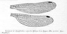 The Himalayan relict dragonfly (Epiophlebia laidlawi) is one of two species of Epiprocta in the family Epiophlebiidae. They have at one time been classified as a suborder Anisozygoptera, considered as intermediate between the dragonflies and the damselflies, partly because the hind wings and fore wings are very similar in size and shape, and partly because the insect at rest holds them back over the body as damselflies do. These attributes now are known to be misleading however; the genus Epiophlebia shares a more recent ancestor with dragonflies and became separated from other Anisoptera in and around the uplifting Himalayas.[1][2]