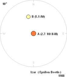 Epsilon Boötis consists of a pair of stars with an angular separation of 2.852 ± 0.014 arcseconds at a position angle of 342.°9 ± 0.°3.[20] The brighter component (A) has an apparent visual magnitude of 2.37,[2] making it readily visible to the naked eye at night. The fainter component (B) is at magnitude 5.12,[3] which by itself would also be visible to the naked eye. Parallax measurements from the Hipparcos astrometry satellite[21][22] put the system at a distance of about 203 light-years (62 parsecs) from the Earth.[1] This means the pair has a projected separation of 185 Astronomical Units and they orbit each other with a period of at least 1,000 years.[15]
