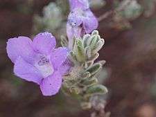 Felty-leaved eremophila is an ideal small shrub for a container or rockery with its silvery foliage and lilac-coloured flowers. It can be propagated from cuttings or grafted onto Myoporum species. Full sun and well-drained soils are preferred and the plant is drought resistant but is killed by frost.[7]