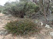 - Eremophila densifolia F.Muell. subsp. densifolia[2][6] which is a densely branched, prostrate shrub with glabrous leaves, sepals that lack glandular hairs near their tips and a petal tube that is glabrous on the outside, flowering September to December;[7][3]