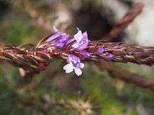 The flowers are borne singly in leaf axils. There are 5 lance-shaped greenish-coloured sepals which are 3.5–6.5 mm (0.1–0.3 in) long. The petals are 9.5–14 mm (0.4–0.6 in) long and joined at their lower end to form a tube. The outside of the petal tube is a shade of purple to lilac-coloured and the inside is white with purple spots. The petal tube is usually mostly glabrous except for the lower petal lobe and the inside of the tube which have long, soft hairs. The 4 stamens are enclosed in the petal tube. Flowering time differs between subspecies but in each case is followed by fruits which are dry, oval shaped and 2.5–3 mm (0.1–0.1 in) long.[2][3]