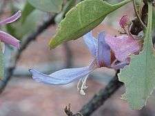 The flowers are borne singly in leaf axils from which they hang on a glabrous stalk 30–45 mm (1–2 in) long. There are 5 overlapping, reddish-purple, egg-shaped sepals which differ in size from each other, the longest ones 24–31 mm (0.94–1.2 in) while the shortest is 15–25 mm (0.59–0.98 in) long. The outer surface of the sepals is hairy and the inner surface glabrous. The petals are 40–50 mm (1.6–2.0 in) long and joined at their lower end to form a tube. The tube is brown but the petal lobes on its end purplish-blue and up to 20 mm (0.8 in) long, with two of the lobes spreading like rabbits' ears. The outer surface of the tube and both sides of the lobes are covered with short hairs and the inside of the tube is full of long, soft hairs. The 4 stamens extend beyond the end of the petal tube. Flowering occurs from June to September and is followed by fruits which are dry, oval shaped with a pointed end and 6–9 mm (0.24–0.35 in) long.[2][3]