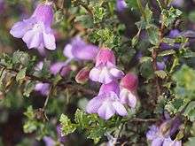 The flowers are borne singly or in pairs in leaf axils on a sticky stalk, usually 9–18 mm (0.4–0.7 in) long. There are 5 green to purplish-brown, lance-shaped to egg-shaped overlapping sepals which are very hairy on their inner surface. The petals are 16–23 mm (0.6–0.9 in) long and are joined at their lower end to form a tube. The petal tube is deep purple to mauve on the outside and white with yellow-brown spots inside. The outside of the tube and petal lobes are densely hairy but the inside of the lobes is glabrous and the inside of the tube is woolly. The 4 stamens are fully enclosed in the petal tube. Flowering occurs from March to October and is followed by woody, almost spherical fruits which have a hairy, papery covering and are 5.5–8.5 mm (0.2–0.3 in) in diameter.[1][2]