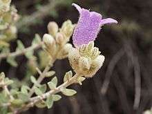 Eremophila malacoides, commonly known as frontage poverty bush,[2] is a flowering plant in the figwort family, Scrophulariaceae and is endemic to Western Australia. It is a shrub with grey-green foliage, densely hairy leaves, and usually lilac to purple flowers but a yellow flowered form also occurs.