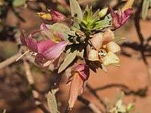 Eremophila miniata, commonly known as kopi poverty bush,[2] or plumridge[3] is a flowering plant in the figwort family, Scrophulariaceae and is endemic to Western Australia. It is an erect shrub with many tangled branches, greyish leaves and flowers which vary in colour, ranging from reddish to yellow or cream.