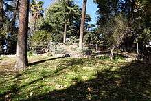 But all just was a project until Cánovas del Castillo in 1897 it interested in the monument and the museum it ceded to City Hall of Madrid ordering its transfer to the Buen Retiro Park under the supervision and project of the architect Ricardo Velázquez Bosco.[4] The location, next to the intersection of O 'Donnell with Menéndez Pelayo, very close to the Montaña Artificial, is pleasant, surrounded by greenery and centenary trees and could have been a ruins to the romantic taste, but the building suffered another forgotten and abandoned. Finally at the beginning of 21st century City Council of Madrid sent to tidy the place recovering stones, capitals, shafts, cornices, etc. that were scattered in the environment.