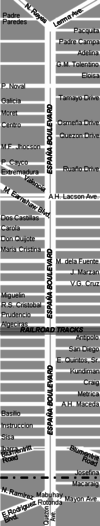 España is an east-west artery of Manila. It connects Lerma and Nicanor Reyes (formerly Morayta) streets of Sampaloc district at the west end to the Mabuhay (or Welcome) Rotonda, Quezon City at the east end. The entire street is straddled by a center island, which is only broken at major intersections and at the railroad crossing. Vehicles are allowed to make a left-turn only on two intersections: southward to Lacson Avenue and at the western terminus going to Nicanor Reyes Street. España is two kilometers long.