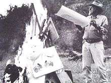 In 1976, DeGrazia engaged in a protest against the Federal Inheritance Tax. The artist claimed the U.S. Internal Revenue Service rulings made him "a millionaire on paper, but my heirs will have to pay taxes for which there is no money." In his well-publicized protest, DeGrazia rode horseback into the Superstition Mountains and burned about 100 of his paintings, an estimated worth of 1.5 million dollars at the time. Ted, protesting the inheritance tax, burned several hundred originals and prints in the Superstition Mountains c. 1976.[10]