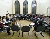 Today, EUSP maintains a good relationship with different levels of government and administration, as evidenced among other things by a visit and meeting of the Russian Minister for Education and Science Andrei Fursenko[12] with the faculty and students at EUSP on 4 June 2009 and by the address by deputy governor of Saint Petersburg Mikhail Oseevsky[13][14] at the opening of the academic year ceremony on 7 September 2009. At a similar ceremony on 5 September 2011 the faculty and students of EUSP were greeted by the deputy chairman of the Saint Petersburg Committee for Science and Higher School Alexander Matveev.