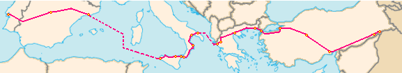 The E 90 routes through five European countries, and includes four sea-crossings: Barcelona, Spain - Mazara del Vallo, Italy; Messina, Italy to Reggio di Calabria, Italy; Brindisi, Italy to Igoumenitsa, Greece, and Eceabat, Turkey to Canakkale, Turkey.