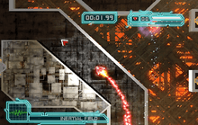 Evasive Space is an action game with 3D graphics procedurally generated by High Voltage Software's Quantum3 game engine. Often erroneously labeled as a classic-style shooter,[2] players guide their ship by using the Wii Remote's infrared pointer to avoid obstacles and enemies and collect items and power-ups. The controls are simple: the player points the cursor in the direction they wish to travel and depress the throttle (B button) to move. The further the cursor is from the ship, the faster it travels. When the ship hits a wall or obstacle, it becomes stunned momentarily. Obstacles include enemy turrets, black holes, asteroids, and narrow environments which restrict the player's movement. Items include Energy Cells responsible for powering the ship, Chronospheres that rewind back 5 seconds to the mission timer, and Diodes that can unlock up to six ship upgrades, the first of which being an energy shield that protects the ship from damage.[3] Some levels are completed by collecting a set number of items, and other require the player to guide their ship to the end of the level before a time limit expires.[2]