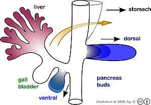As part of embryonic development the pancreas forms from the embryonic foregut and is therefore of endodermal origin. Pancreatic development begins with the formation of a ventral and a dorsal pancreatic bud. Each structure communicates with the foregut through a duct. The dorsal pancreatic bud forms the head, neck, body, and tail, whereas the ventral pancreatic bud forms the uncinate process.[8]