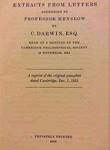 Extracts from Letters to Henslow is an 1835 pamphlet published by John Stevens Henslow at his own expense of extracts from ten letters Charles Darwin sent him while on HMS Beagle. This pamphlet helped to establish Darwin's reputation amongst renowned scientific publications. However, upon learning of this pamphlet's publication Darwin was "a good deal horrified" at Henslow making public "what had been written without care or accuracy".[1]