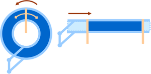 In this example, all these paths lead to the same rate of change of flux, and hence the same EMF. To provide some intuition about this path independence, in Figure 3 the Faraday disc is unwrapped onto a strip, making it resemble a sliding rectangle problem. In the sliding rectangle case, it becomes obvious that the pattern of current flow inside the rectangle is time-independent and therefore irrelevant to the rate of change of flux linking the circuit. There is no need to consider exactly how the current traverses the rectangle (or the disc). Any choice of path connecting the top and bottom of the rectangle (axle-to-brush in the disc) and moving with the rectangle (rotating with the disc) sweeps out the same rate-of-change of flux, and predicts the same EMF. For the disc, this rate-of-change of flux estimation is the same as that done above based upon rotation of the disc past a line joining the brush to the axle.