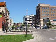 The skyline of downtown Fargo as seen from Main Avenue, facing north.