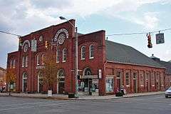 Farmers Market, also known as York Farmers' Market and Market & Penn Street Farmers' Market, is a historic public market located at York, Pennsylvania, York County, Pennsylvania, U.S.A. It was built in 1876 and expanded about 1890. The original section is a simple 60 feet wide and 80 feet long gable roofed brick building. A 40 foot wide rectangular section was added in the expansion and the two sections were joined under a single, moderately pitched gable roof. With the expansion, a five bay wide false front was added to unify the building. The front facade features two ornamental circular windows. Attached to the main building are three auxiliary buildings including a Queen Anne style stable.[2]