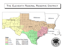 The Federal Reserve Bank of Dallas covers the Eleventh Federal Reserve District, which includes Texas, northern Louisiana and southern New Mexico, a district sometimes referred to as the Oil Patch.[1] The Federal Reserve Bank of Dallas is one of 12 regional Reserve Banks that, along with the Board of Governors in Washington, D.C., make up the nation's central bank. The Dallas Fed is the only one where all external branches reside in the same state (although the region itself includes northern Louisiana as well as southern New Mexico). The Dallas Fed has branch offices in El Paso, Houston, and San Antonio. The Dallas bank is located at 2200 Pearl St. in the Uptown neighborhood of Oak Lawn, just north of downtown Dallas and the Dallas Arts District. Prior to 1992, the bank was located at 400 S. Akard Street, in the Government District in Downtown Dallas. The older Dallas Fed building, which opened in 1921, was built in the Beaux-arts style, with large limestone structure with massive carved eagles and additional significant detailing; it is a City of Dallas Designated Landmark structure. The current Dallas Fed building, opened in September 1992, was designed by three architectural firms: Kohn Pedersen Fox Associates, New York; Sikes Jennings Kelly & Brewer, Houston; and John S. Chase, FAIA, Dallas and Houston, Dallas-based Austin Commercial Inc. served as project manager and general contractor.