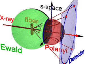 Non-ideal fiber patterns are obtained in experiments. They only show mirror symmetry about the meridian. The reason is that the fiber axis and the incident beam (X-rays, electrons, neutrons) cannot be perfectly oriented perpendicular to each other. The corresponding geometric distortion has been extensively studied by Michael Polanyi introducing the concept of Polanyi's sphere (German: "Lagenkugel") intersecting Ewald's sphere. Later Rosalind Franklin and Raymond Gosling have carried out their own geometrical reasoning and presented an approximative equation for the fiber tilt angle β. Analysis starts by mapping the distorted 2D pattern on the representative plane of the fiber. This is the plane that contains the cylinder axis in reciprocal space. In crystallography first an approximation of the mapping into reciprocal space is computed that is refined iteratively. The digital method frequently called Fraser correction starts from the Franklin approximation for the tilt angle β. It eliminates fiber tilt, unwarps the detector image, and corrects the scattering intensity. The correct equation for the determination of β has been presented by Norbert Stribeck.