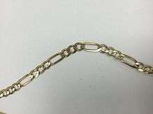 Figaro is a popular gold or silver link chain design that incorporates a pattern of 2 or 3 small circular links with 1 elongated oval link. The most notable figaro chains are manufactured in Italy. They are usually worn by men and are often adorned with pendants such as crosses and medallions.