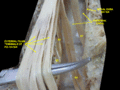 ![]() Cauda equina and filum terminale seen from behind. The dura mater has been opened and spread out, and the arachnoid has been removed. (Filum terminale labeled at center right.) | |