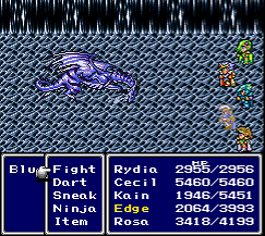 It is revealed that Rosa, Cecil's love interest, had followed him and is extremely ill with a fever. Soon after this, Cecil and Rydia meet Tellah, who is going to Damcyan Castle to retrieve his eloping daughter, Anna.[11] However, Anna is killed when the Red Wings bomb the castle. Edward, Anna's lover and the prince of Damcyan, explains that the Red Wings' new commander, Golbez, did this to steal the Fire Crystal for Baron as they had stolen the Water Crystal from Mysidia.[12] Tellah leaves the party to exact revenge on Golbez for Anna's death.[13] After finding a cure for Rosa, the party decides to go to Fabul to protect the Wind Crystal. Here they meet Master Yang, a warrior monk serviced to the kingdom and the protection of the crystal. The Red Wings attack, and Kain reappears as one of Golbez's servants. He attacks and defeats Cecil; when Rosa intervenes, Golbez kidnaps her and Kain takes the crystal.[14] On the way back to Baron, the party is attacked by Leviathan and separated.