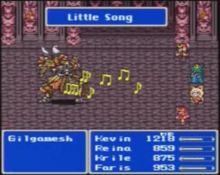 Final Fantasy V is the second Final Fantasy game to use the Active Time Battle (ATB) system, in which time flows continuously for both the player and enemies during combat.[3] This system was first established in Final Fantasy IV, but in that game there was no way to visibly anticipate which character's turn would come up next.[4] In Final Fantasy V, the player can see which playable character's turn is next in battle, in the form of a time gauge—or "ATB Bar"—which fills according to a character's speed. When the selected character's turn arrives, the player can execute one of several commands, such as attacking the enemy with an equipped weapon, using a special ability or item, or changing the character's row position.[5] The ATB mechanic with a gauge, as seen in Final Fantasy V, would be used in the four following main titles in the series and remains a staple mechanic of the franchise.[6]