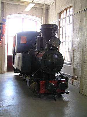 A 1:8 scale live steam train running on the museum's miniature track.- Plaque of the British "Neilson and Company" locomotive at the Museum.