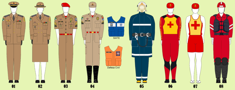 The Firefighters Corps of Paraná wear the same uniforms of the Military Police of Paraná, just adding their badges and insignias.