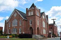 First Baptist Church, also known as Main Street Baptist Church, is a historic Baptist church located at 126 N. Main Street in Kernersville, Forsyth County, North Carolina. It was built in 1915-1916, and is a two-story cross-gabled brick building, with Gothic Revival and Tudor Revival style design elements. It has a cross-gable roof, three-stage corner entrance tower, and retains original furnishings.[2]