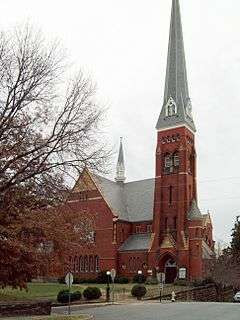 The First Baptist Church, a historic Baptist church located at Lynchburg, Virginia. It is built of hard-pressed red brick on a rough granite foundation. The main facade of the church, facing Eleventh Street, and the two sides are centered with large rose windows framed within Gothic arches covered with hood moldings. Construction began in 1884 and the church was dedicated in 1886. In the 1920s, Lynchburg architect Stanhope S. Johnson designed the complementary Sunday School annex. In 1941, the interior of the sanctuary was modified by Stanhope S. Johnson, with the creation of a divided chancel. It is home to the oldest Baptist congregation of Lynchburg, established in July 1815.[3]