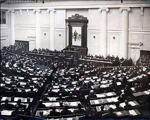 The State Duma or Imperial Duma was a legislative assembly in the late Russian Empire, which held its meetings in the Taurida Palace in St. Petersburg. It was convened four times between 27 April 1906 and the collapse of the Empire in February 1917. The First and the Second Dumas were more democratic and represented a greater number of national types than their successors.[1] The Fourth Duma was dissolved on 6 October 1917.