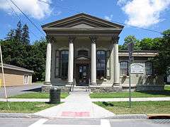 First National Bank of Morrisville, also known as First Trust & Deposit Co. or Key Bank, is a historic bank building located at Morrisville in Madison County, New York. It was built in 1864 and expanded in the 1890s, 1920s, and 1950s. It is a single story brick building that features a finely detailed tetrastyle, Corinthian order portico.[2]