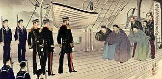 Chisholm, Hugh, ed. (1911). "Chino-Japanese War". Encyclopædia Britannica. 6 (11th ed.). Cambridge University Press. pp. 233–235. - ↑ "Japan Anxious for a Fight; The Chinese Are Slow and Not in Good Shape to Go to War," New York Times. July 30, 1894.