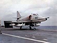 Vengeance was returned to the United Kingdom in 1955, with the crew transferred to Majestic, which was commissioned into the RAN as HMAS Melbourne on 28 October 1955.[19] The new carrier delivered new aircraft to the Fleet Air Arm: the de Havilland Sea Venom jet fighter-bomber for 805 and 808 Squadrons, and the turboprop-driven Fairey Gannet anti-submarine aircraft for 816 and 817 Squadrons.[16] These aircraft were due to become obsolete in the late 1950s, and the RAN considered purchasing modern aircraft of French or Italian design, which were smaller than British developments and better suited to light carrier operations.[20] By the end of the 1950s, with Sydney decommissioned from service and refitted as a troop transport, it was decided that fixed-wing naval aviation would be replaced by a force of 27 Westland Wessex anti-submarine helicopters, to operate from Melbourne.[21] This decision was rescinded in 1963, with Grumman S-2E Tracker anti-submarine aircraft and McDonnell Douglas A-4G Skyhawk fighter aircraft ordered for the Fleet Air Arm.[22] Although Melbourne and her air group played no role in the Vietnam War, Australian naval aviators saw action as part of Royal Australian Navy Helicopter Flight Vietnam (a component of the joint Australian-American Experimental Military Unit) and the RAN Detachment, 9 Squadron Vietnam (attached to No. 9 Squadron RAAF).[23]