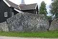 The church yard is fenced with slate brought from Haukeli farm on the west bank of the Lågen River. Some slates have iron rings affixed; these rings were used to tether horses during service. Each farmer had a designated ring for his horse (the oldest dated ring from 1661). The idiosyncratic stone fence is shown on a 1701 painting (the oldest existing painting of a stave church). [4]
