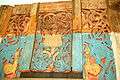 In 1735, the chancel and apse as well as the east wall of the nave were removed. The nave was extended eastwards and two transepts were added, making a cruciform plan. The additions were built in horizontal log construction with notched corners. Portal planks are decorated with carved vines and animal ornamentation. Since few parts of the stave church are preserved, there is only scant remnants of its original decor. Of the original stave church only three outer walls survived, as the internal posts and the raised roof were eliminated.[3]