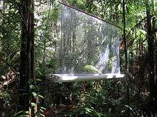 The basis of any Flight Interception Trap consists of an upright placed see-through barrier under which one or more small basins are placed. The barrier may consist of such materials as plastic mesh, a transparent plastic sheet or even Plexiglas,[2] although the latter does not work well for day-active insects since it is visible to them due to its specific refraction. The basins are filled with a preserving fluid such as ethanol[2] (which should be mixed with something bad-tasting (like denatonium) to prevent wild animals drinking it), propylene glycol,[1][2][3] salt-saturated water or even plain water. The best preservative to keep internal organs in good condition is FAACC,[4] a solution of formaldehyde. A small amount of detergent is added to break the surface tension, causing the insects to sink. Yellow (a colour which attracts many insects) pans with soapy water may be used alone. The water itself can be an attractant in dry environments .