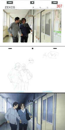 Initially, the director Hiroshi Nagahama declined the offer to direct the anime because he felt it would be best presented as live-action, but reconsidered when he figured out how to adapt it and pitched the idea of using rotoscoping.[16] He felt it was the most appropriate choice because to him, the manga felt very realistic and close to daily life.[17] The live-action filming took around three months to complete on location in Kiryu, Gunma.[7] Along with the editing after, it took about twice the amount of time to produce than a regular anime. The end cards at the end of each episode were animated by Nagahama himself in traditional anime style to differentiate them and he made Oshimi's hair wave around to emulate flash animation.[17]